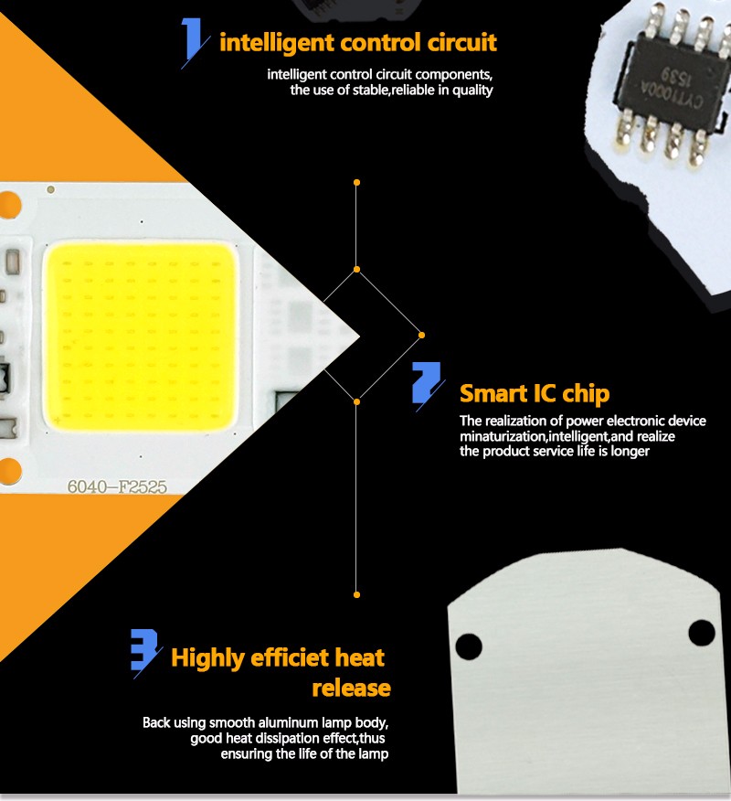 LED Chip 20V s napájecím napětím 220-240V,50-60Hz. Svítivost 2000lumenů při 6000K. Instalaci je nutné provést na hliníkovou desku, která slouží jako chladič pro odvod tepla. Rozměry dle obrázku. Smart IC zabraňující blikání. Úhel světla 180°.